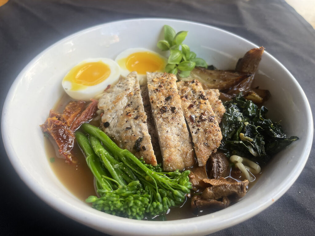 Three-day pork bone broth, pasta/noodles, broccolini, braised fennel bulb, sun dried tomatoes, pork, egg… you have to try this!
